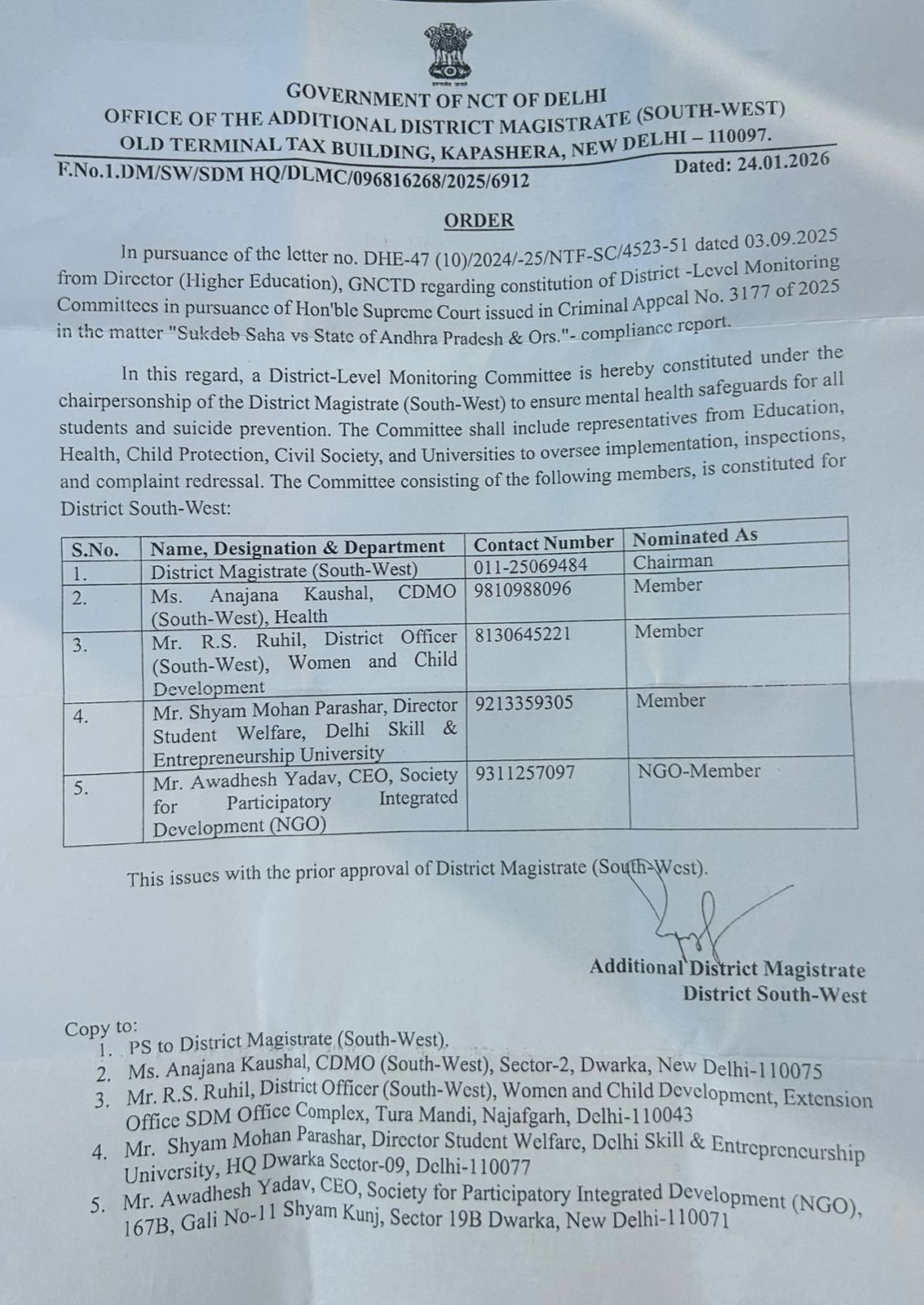 The Government of NCT of Delhi has constituted a District-Level Monitoring Committee under the chairpersonship of the District Magistrate (South-West) to strengthen student mental health safeguards and suicide prevention, as directed by the Hon’ble Supreme Court of India